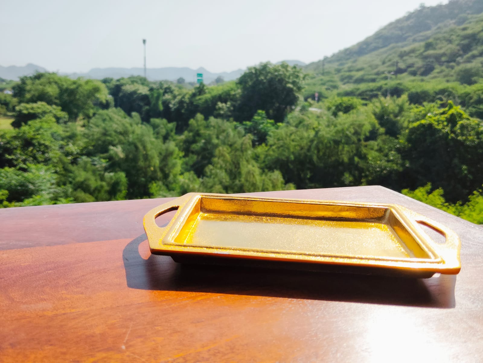 This Elegant gold toned serving tray is a luxurious addition to any home. With its sleek, metallic and minimalist design. Perfect for serving food, holding decorative items. With the use of aluminium makes it perfect in build quality. The gold paint applied by hand ensuring a smooth polished surface.