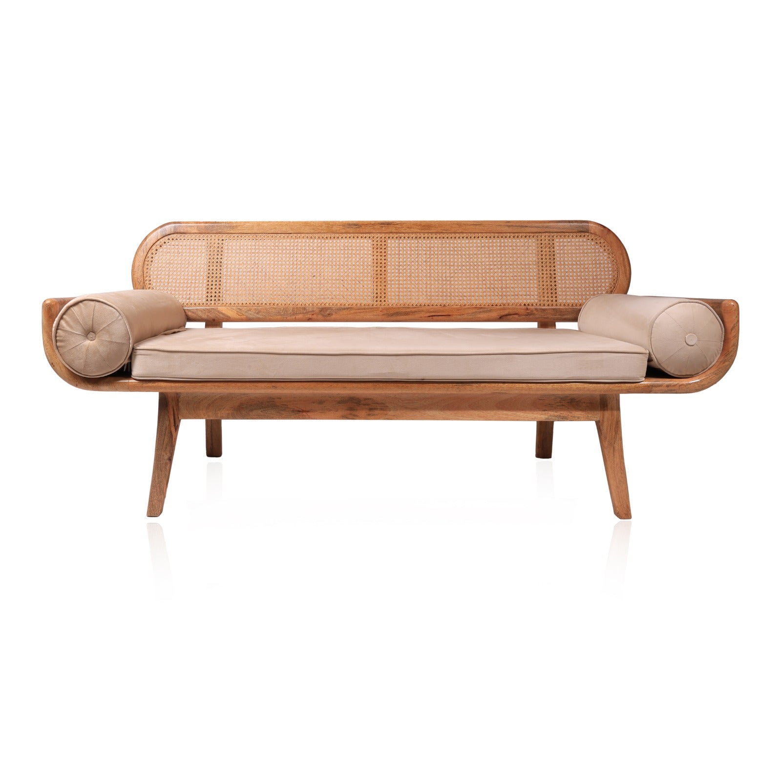 Introducing the "Elegance" 3-seater ellipse sofa, featuring luxurious velvet upholstery and intricately woven cane accents. This stunning piece combines comfort, style, and sophistication, perfect for living rooms, lounges, or reception areas. Experience the epitome of elegance and refinement in home décor.