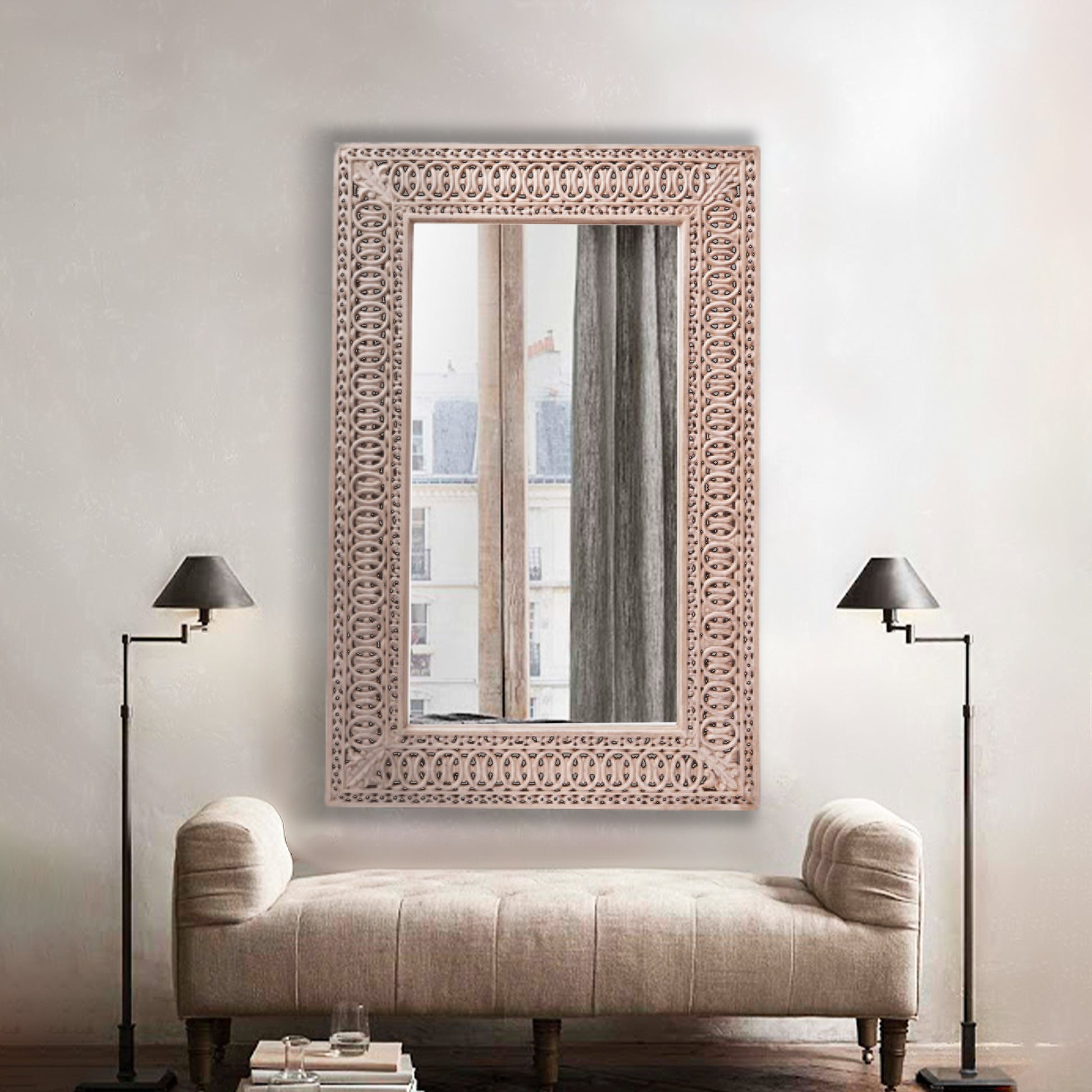 Adding an enchanted vibe, depth, and life to your room, this wall mirror will reflect a regal and royal look to your bedroom and living room décor. A classic addition to any empty wall space, this mirror grilled detailing mirror oozes royalty and luxury from all angles.